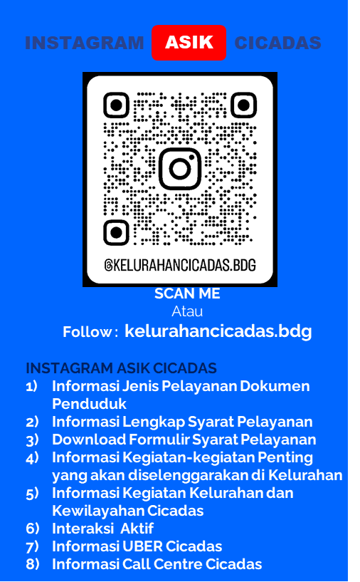 Sebagai informasi kepada masyarakat sehubungan dengan telah aktifnya content subdomain Kelurahan Cicadas, kami berharap kedepan agar masyarakat memahami tentang keberadaan Kantor Kelurahan Cicadas Kecamatan Cibeunying Kidul Kota Bandung yang telah membuat beberapa kebijakan, kegiatan, program serta rencana strategis yang disusun sesuai dengan kebutuhan untuk masyarakat di bidang teknologi informasi untuk pelayanan dalam rangka pengembangan dan penerapan e-Government sebagai bagian dari kebijakan dan strategi nasional pemerintah guna mewujudkan kepemerintahan yang baik (good governance).